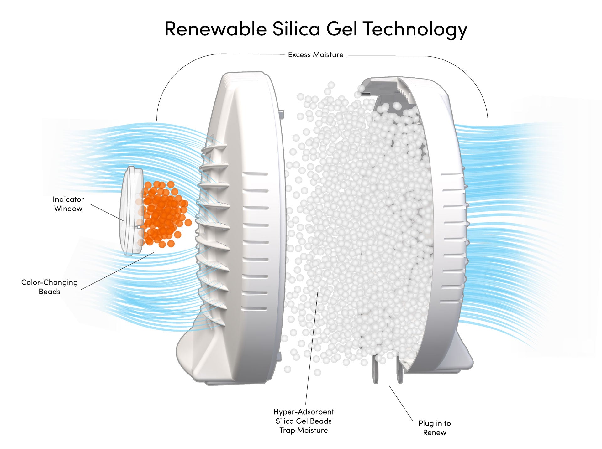 Each E-500 uses renewable silica gel to absorb excess moisture directly from the surrounding air. As moisture is collected, the beads gradually change color, providing a clear visual indication when recharging is needed.